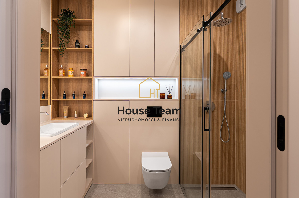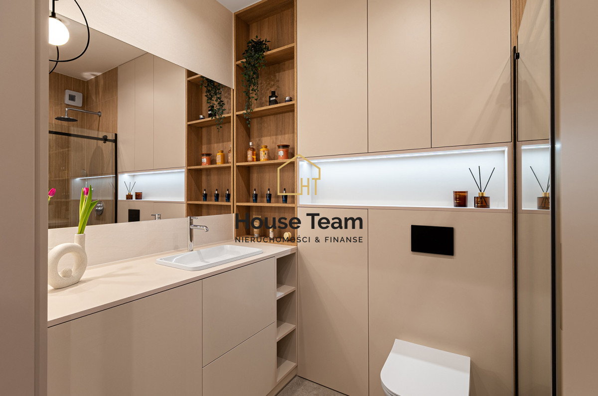 Całość dopełniają stylowe dodatki, eleganckie zasłony i firany szyte na zamówienie oraz nowoczesna klimatyzacja, zapewniająca komfort przez cały rok. Łazienka z toaletą została zaaranżowana w nowoczesnej stylistyce, wyposażona została w kabinę prysznicową typu walk-in z deszczownicą, toaletę oraz praktyczną zabudowę stolarską z miejscem na przechowywanie.