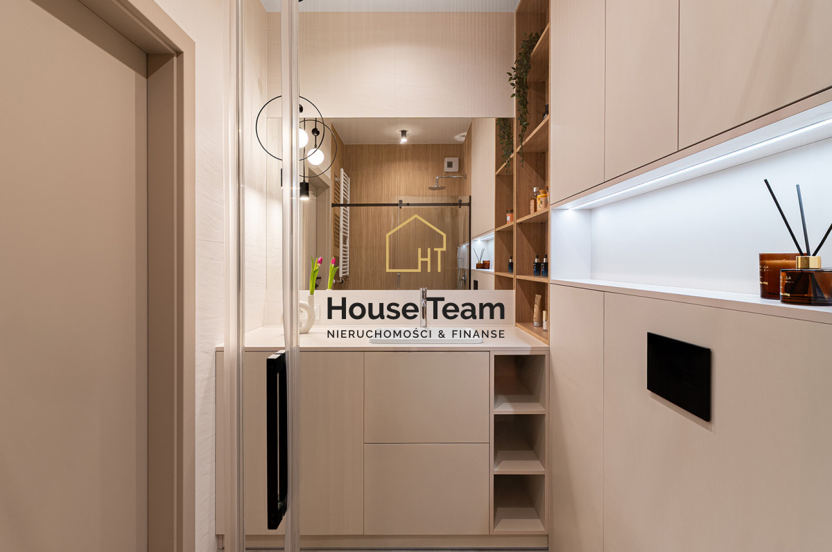 Wnętrze dopełniają lustro, stylowe oświetlenie i armatura o nowoczesnym designie. Funkcjonalny przedpokój zaaranżowano z zabudową stolarską wykonaną na wymiar. Znajduje się tu pojemna szafa garderobiana oraz ławka, która dodaje elegancji i ułatwia codzienne użytkowanie.