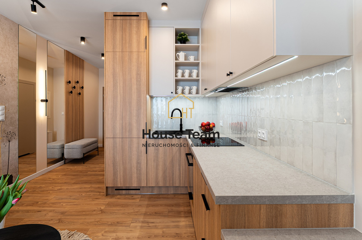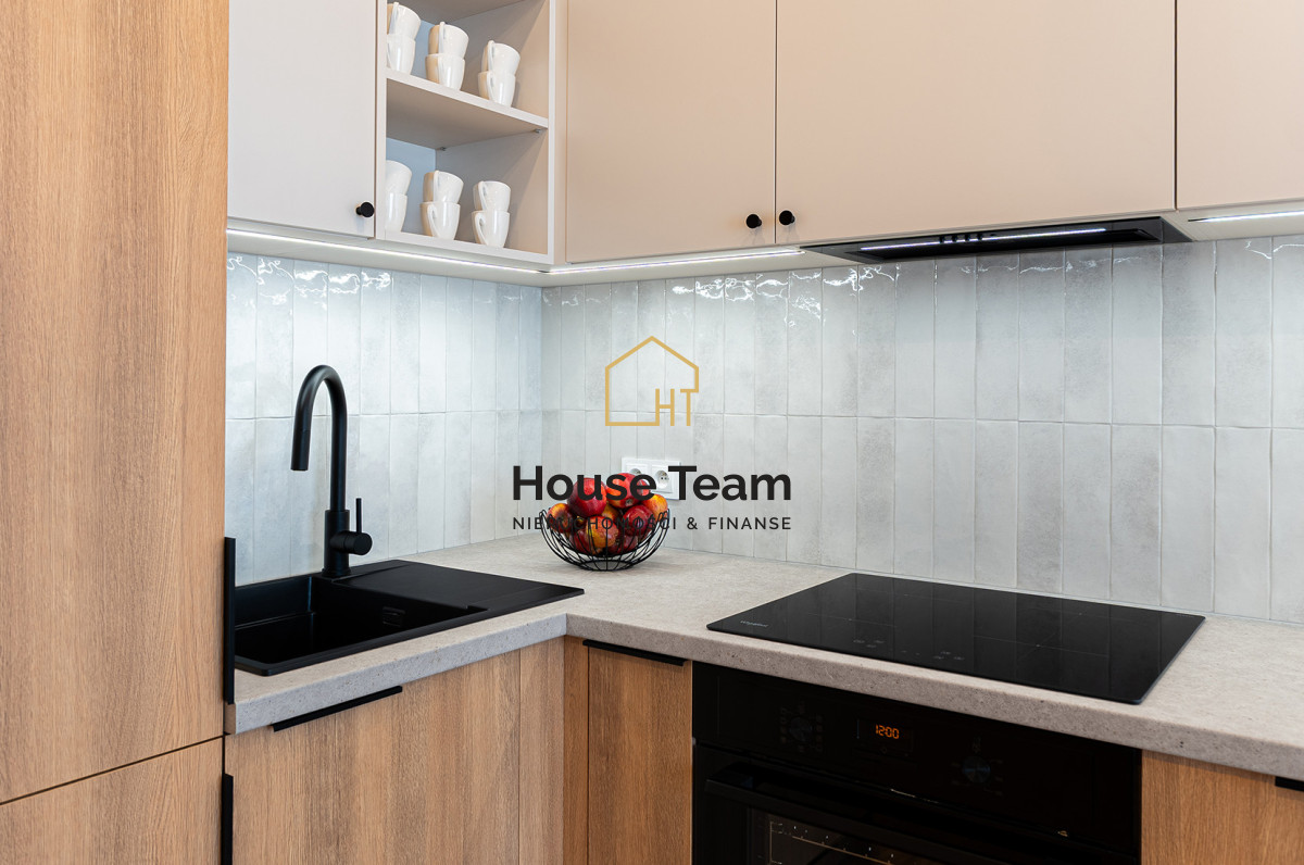 W aneksie kuchennym zastosowano zabudowę stolarską wykonaną na wymiar, z wysokiej jakości frontami i blatami. Kuchnia wyposażona jest w nowy sprzęt AGD: lodówko-zamrażarkę, zmywarkę, płytę indukcyjną, piekarnik oraz okap. Blat pełni również funkcję stołu lub miejsca do pracy.