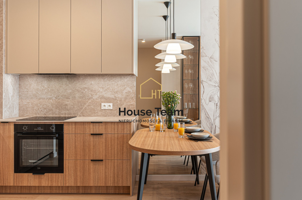 W aneksie kuchennym zastosowano zabudowę stolarską wykonaną na wymiar, z wysokiej jakości frontami i blatami. Kuchnia wyposażona jest w nowy sprzęt AGD: lodówko-zamrażarkę, zmywarkę, płytę indukcyjną, piekarnik oraz okap. Blat pełni również funkcję stołu lub miejsca do pracy.