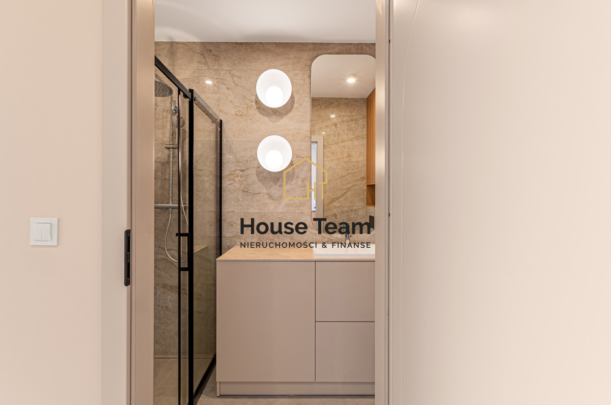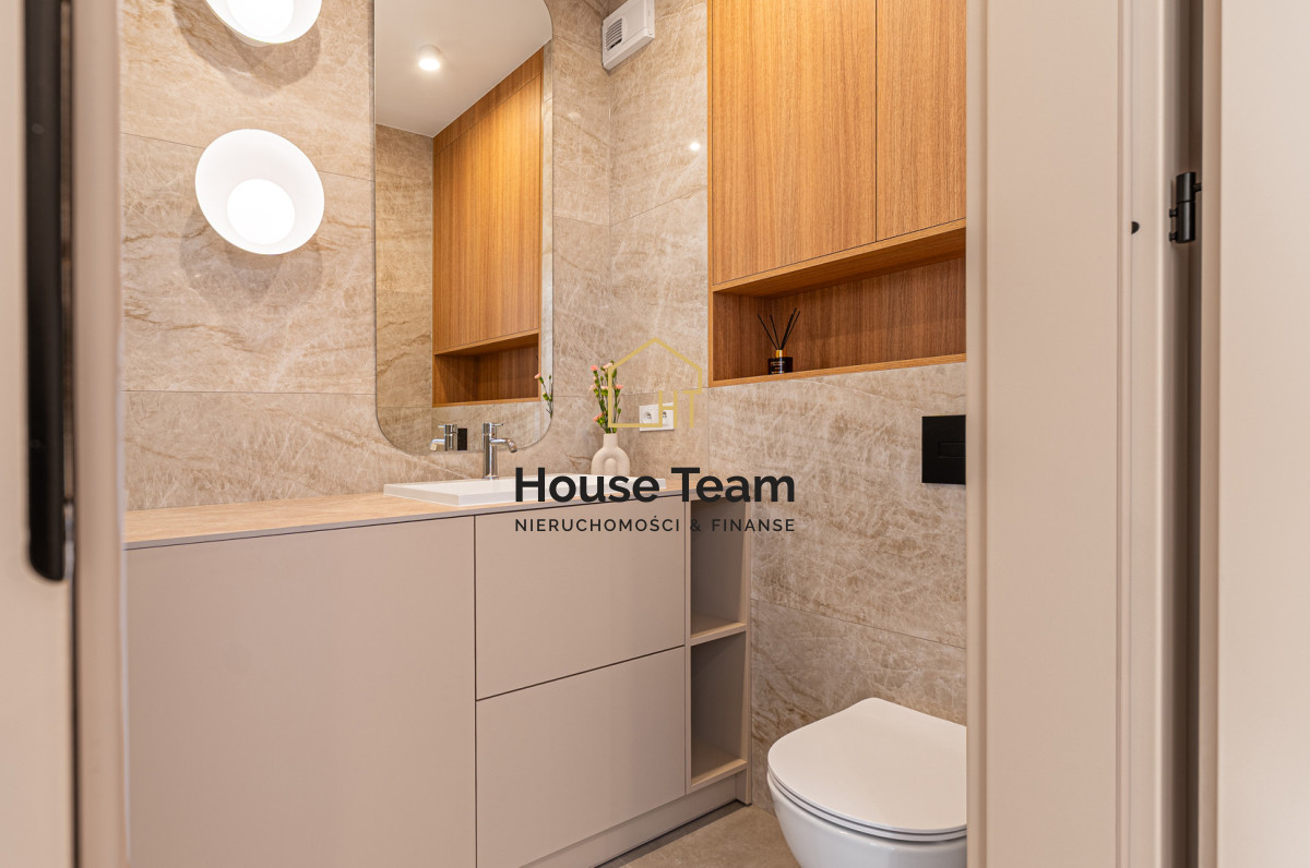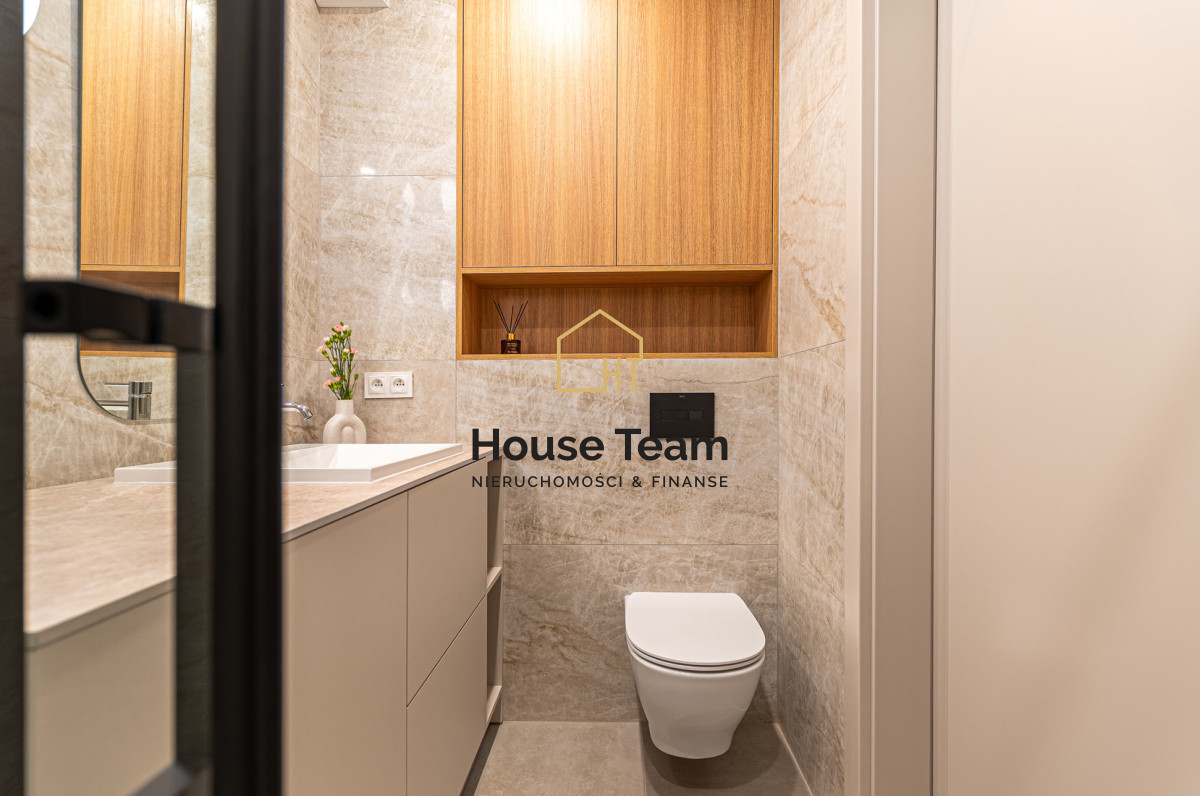 Całość dopełniają stylowe dodatki, eleganckie zasłony i firany szyte na zamówienie oraz nowoczesna klimatyzacja, zapewniająca komfort przez cały rok. Łazienka z toaletą została zaaranżowana w nowoczesnej stylistyce. Wyposażona w kabinę prysznicową typu walk-in z deszczownicą, toaletę oraz praktyczną zabudowę stolarską z miejscem na przechowywanie. Dodatkowo łazienka została wyposażona w pralkę w zabudowie.