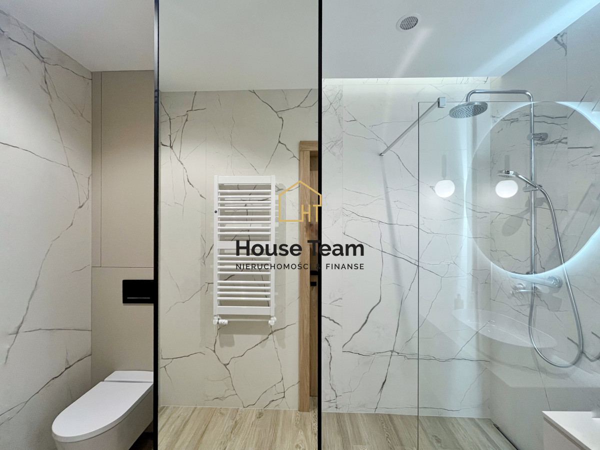 Pierwotnie oddzielna łazienka i toaleta zostały połączone w jedną, przestronną strefę kąpielową. Łazienka została zaprojektowana w otwartą strefę prysznicową, wyposażoną w szklaną ściankę bez drzwi oraz deszczownicę, co wizualnie powiększa przestrzeń. Całość dopina elegancka umywalka nablatowa z pojemnymi szufladami oraz duże podświetlone lustro. W dyskretnie wydzielonej części znajduje się toaleta. Wnętrze utrzymano w jasnych kolorach - ściany zdobi gres imitujący marmur, a na podłodze położono kafle drewnopodobne w ciepłym odcieniu.