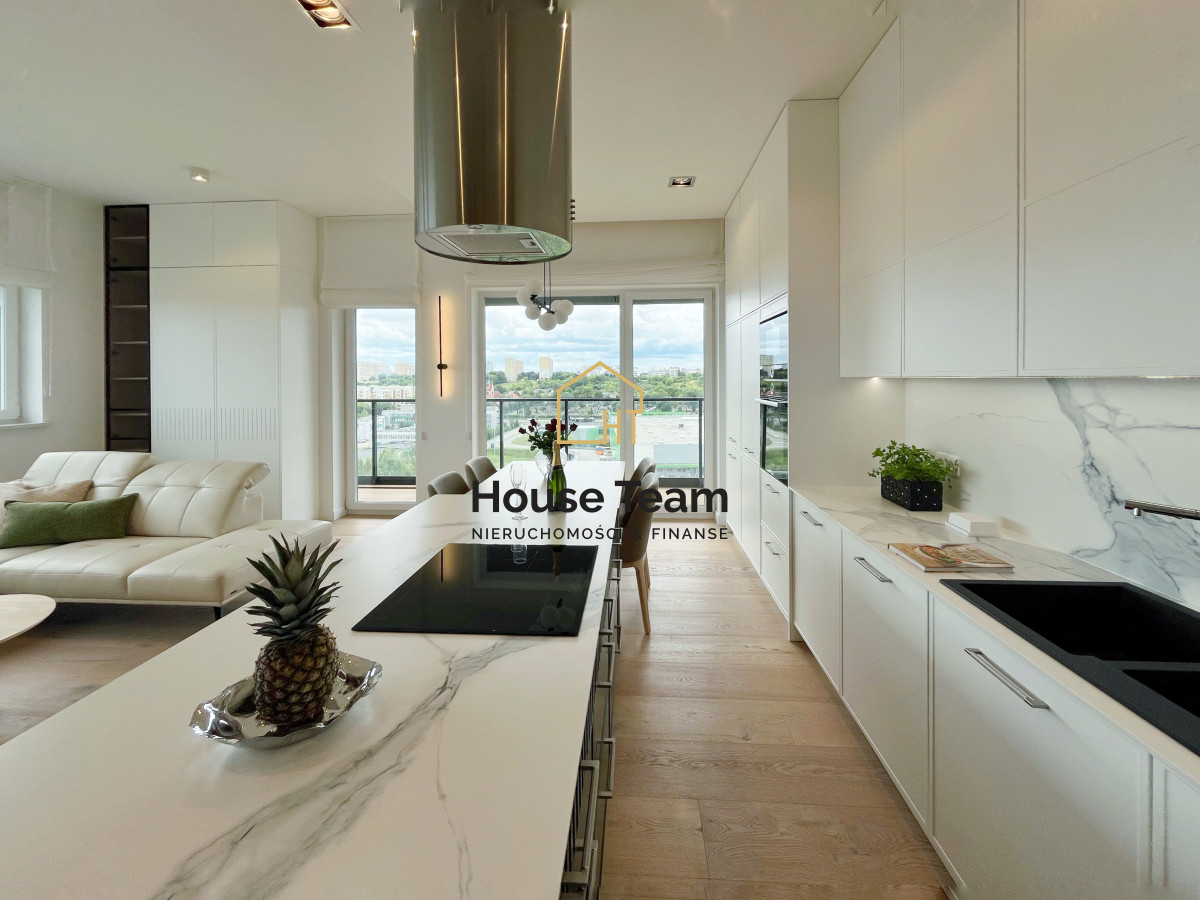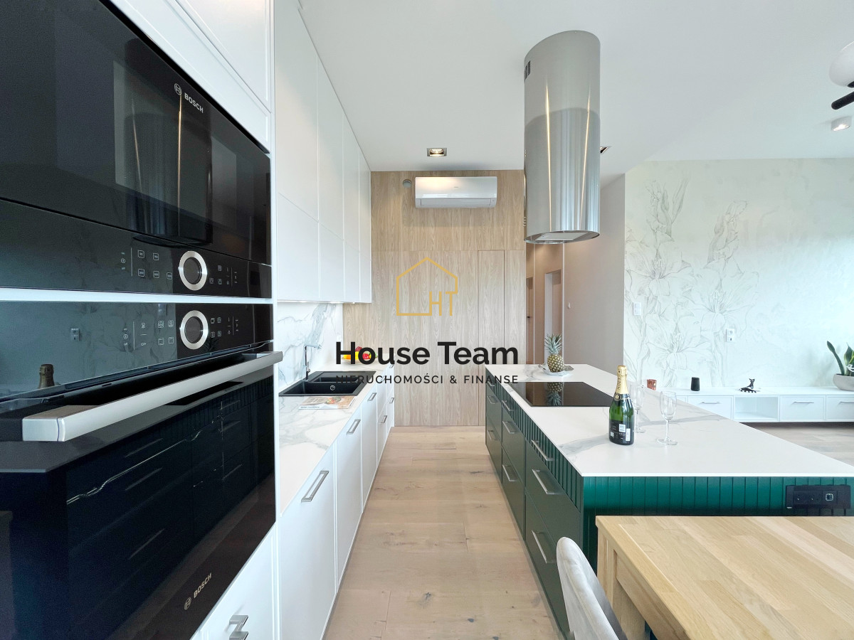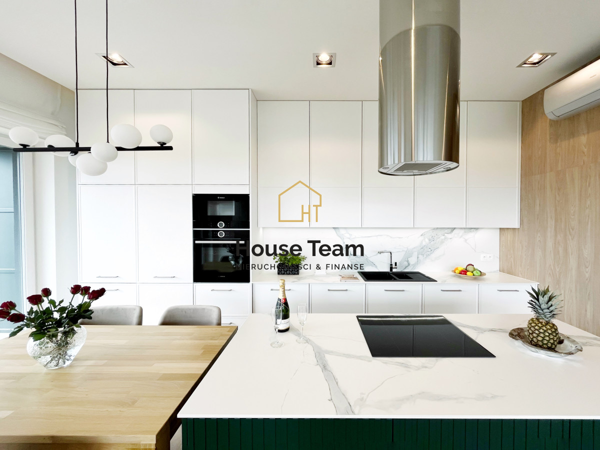 Zabudowa kuchenna, utrzymana w eleganckim białym kolorze, sięga aż po sufit, oferując mnóstwo miejsca do przechowywania. Kuchnia została w pełni wyposażona w wysokiej klasy sprzęt AGD: