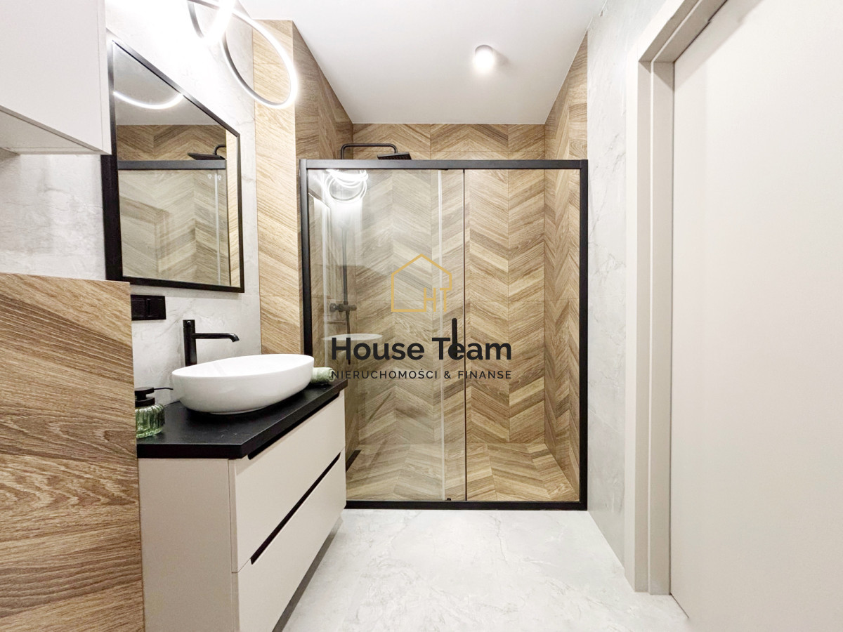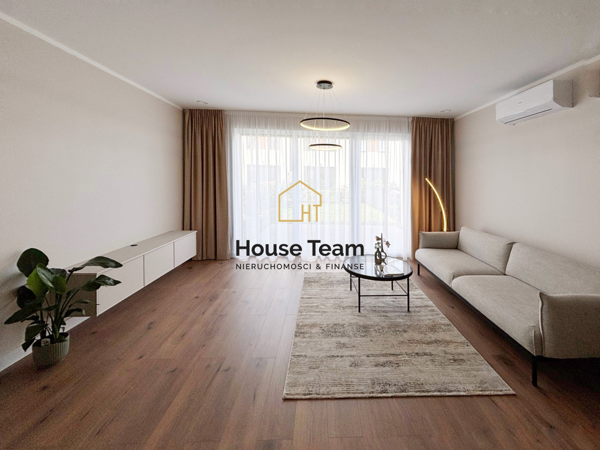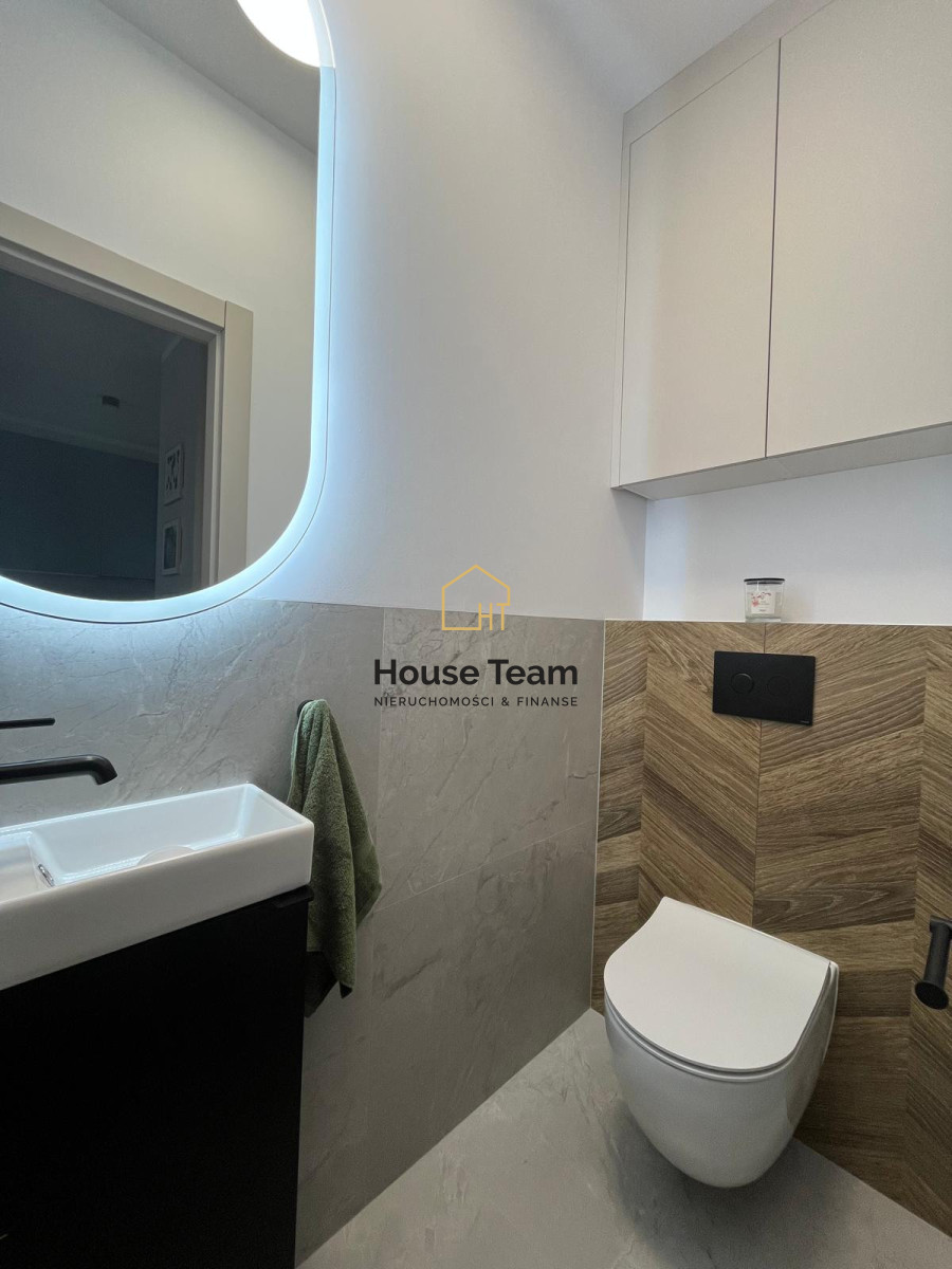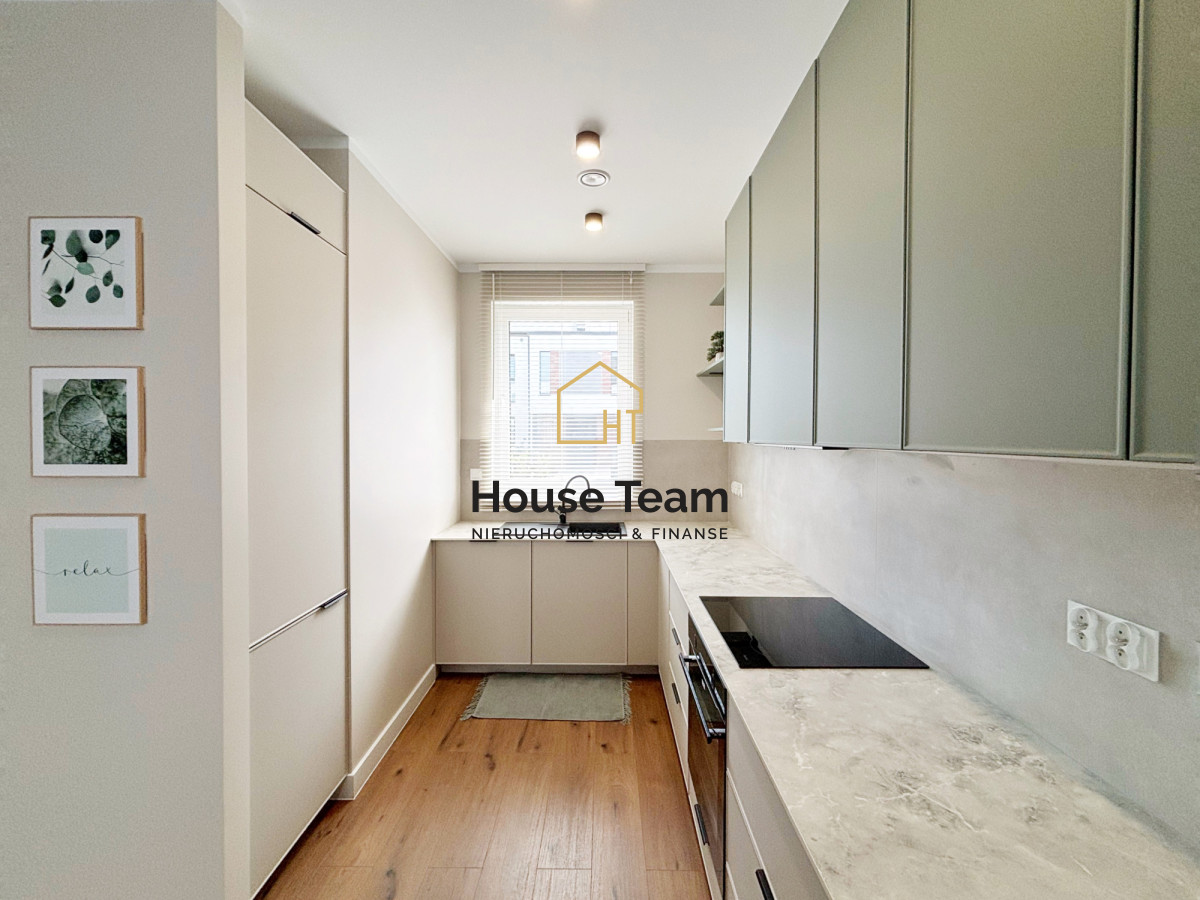 Wchodząc do nieruchomości, trafiamy do niedużego holu z praktyczną szafą w zabudowie, prowadzącego do jasnego salonu z aneksem kuchennym. Kuchnia zaaranżowana została w wysokiej jakości eleganckiej zabudowie kuchennej na wymiar oraz kompletnym sprzętem AGD. Część kuchenną oddziela funkcjonalna wyspa z hokerami. W części dziennej znajdują się stylowe meble wypoczynkowe. Wnętrze ocieplają eleganckie firany, zasłony a także stylowe dodatki. Komfort mieszkańców podnosi zainstalowana klimatyzacja, która idealnie sprawdzi się w upalne dni.